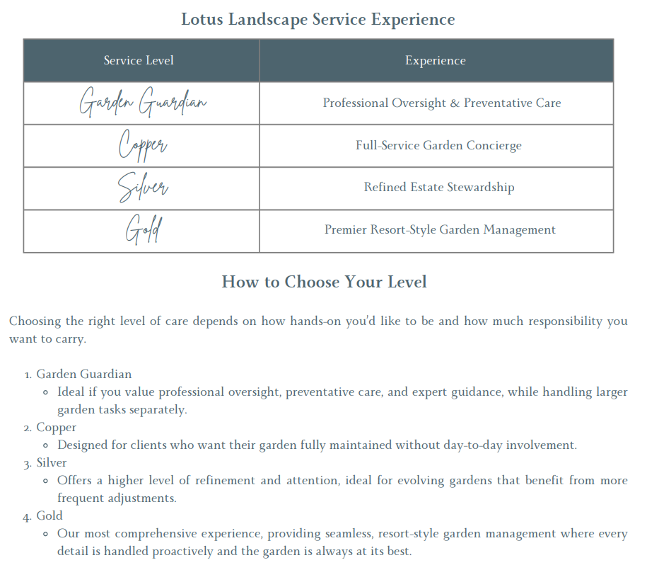 Every Lotus Landscape client benefits from the same professional spring priorities. The difference between service levels is how much of the work we handle for you.